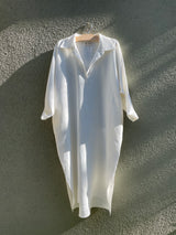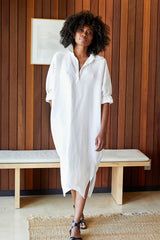 Tailored collared dress with spacious sleeves, a long, straight fit, and deep pockets. Falls mid-calf, with dramatic slits up the sides for movement. Wear loose for maximum comfort or with the linen belt for a fitted look.